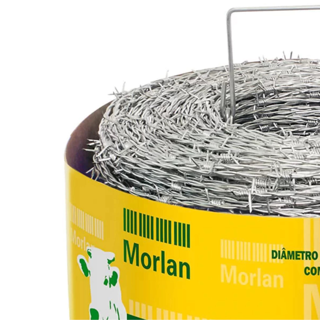 O arame farpado Nelore Morlan é fabricado com aço zincado para proteção contra a corrosão e possui classificação de resistência mínima de 250 kgf. Suas farpas extremamente cortantes, são firmemente posicionadas a uma distância de 5\\" (125 mm) uma da outra (e não saem do lugar).