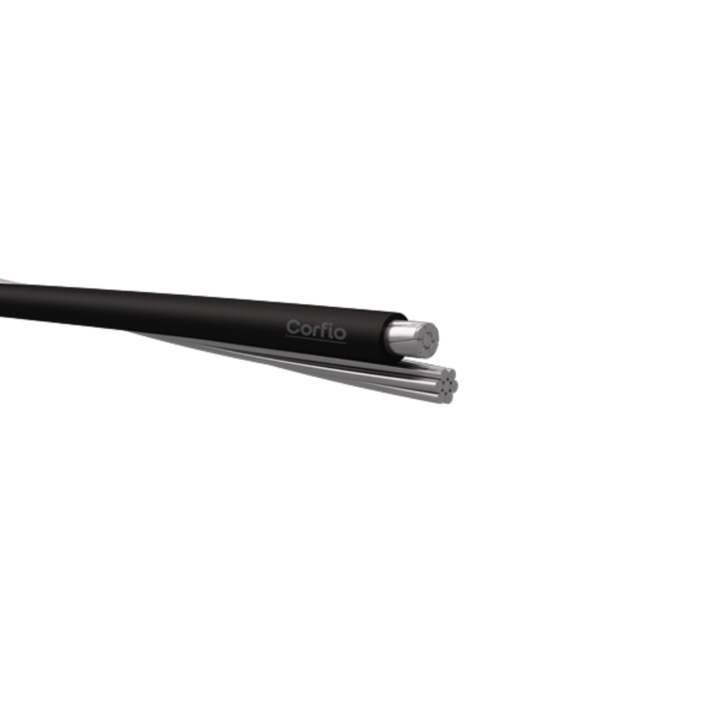 Cabo de potência multiplexado autossustentado corfio, projetado para circuitos de alimentação e distribuição de energia em tensões de até 0,6/1 KV, em instalações aéreas fixadas em postes ou fachada