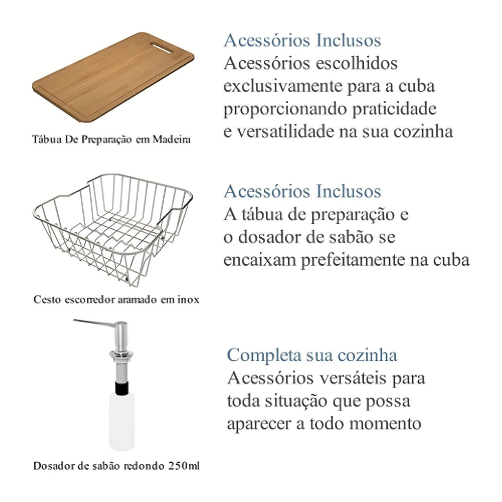 • Acessórios Inclusos: Tábua de Madeira, Cesto Aramado e Dosador de Sabão.